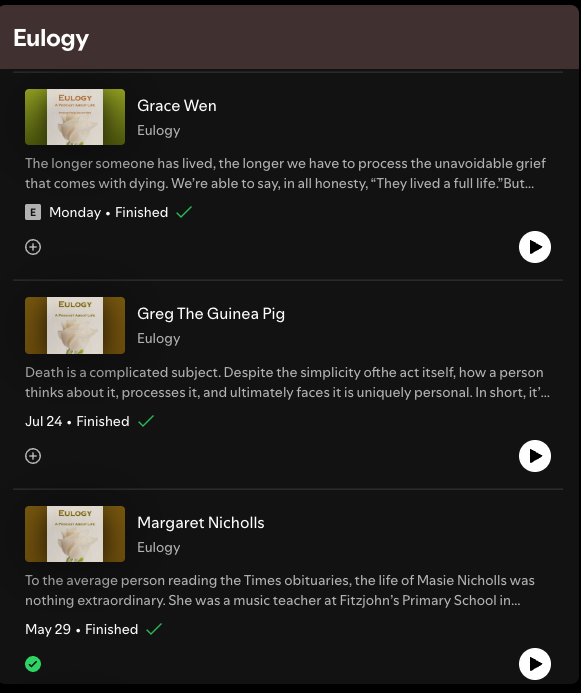 It’s this volatile mix of one-upmanship, the spilling of tea, and death-inspired honesty that makes Eulogy such a unique, interesting and addictive podcast.